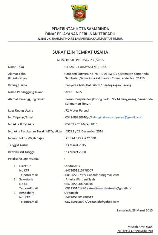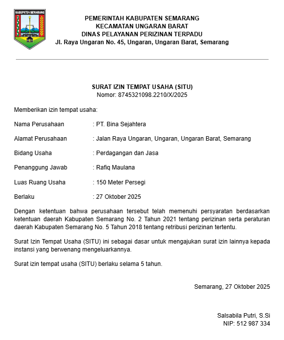 1. Contoh Surat Izin Tempat Usaha (SITU)