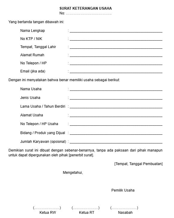 3. Contoh Surat Izin Tempat Usaha RT RW