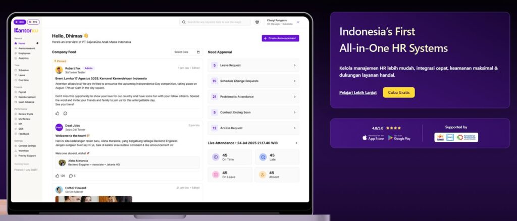 - Rekrutmen sistem ATS + AI, bisa screening otomatis, repost ke LinkedIn, dan filter kandidat sesuai kebutuhan.