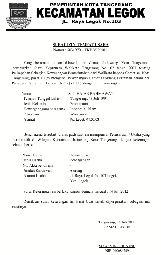 6. Contoh Surat Keterangan Izin Tempat Usaha