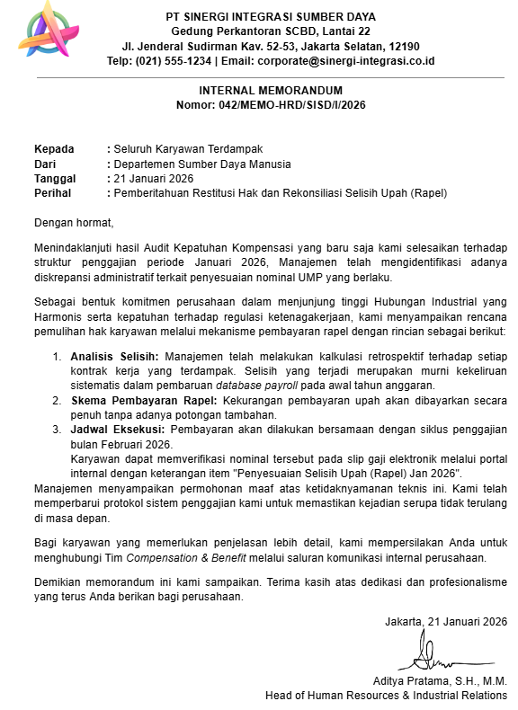 Rekan-rekan sekalian, berdasarkan hasil tinjauan berkala (compliance audit) yang baru saja diselesaikan oleh tim internal kami terkait struktur penggajian, kami menemukan adanya anomali administratif dalam penyesuaian nilai upah terhadap regulasi minimum terbaru.