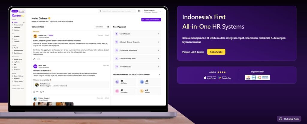 Dari rekrutmen dengan ATS, hitung payroll otomatis, manajemen performa, hingga onboarding, semuanya tersedia lengkap diKantorKu HRIS.