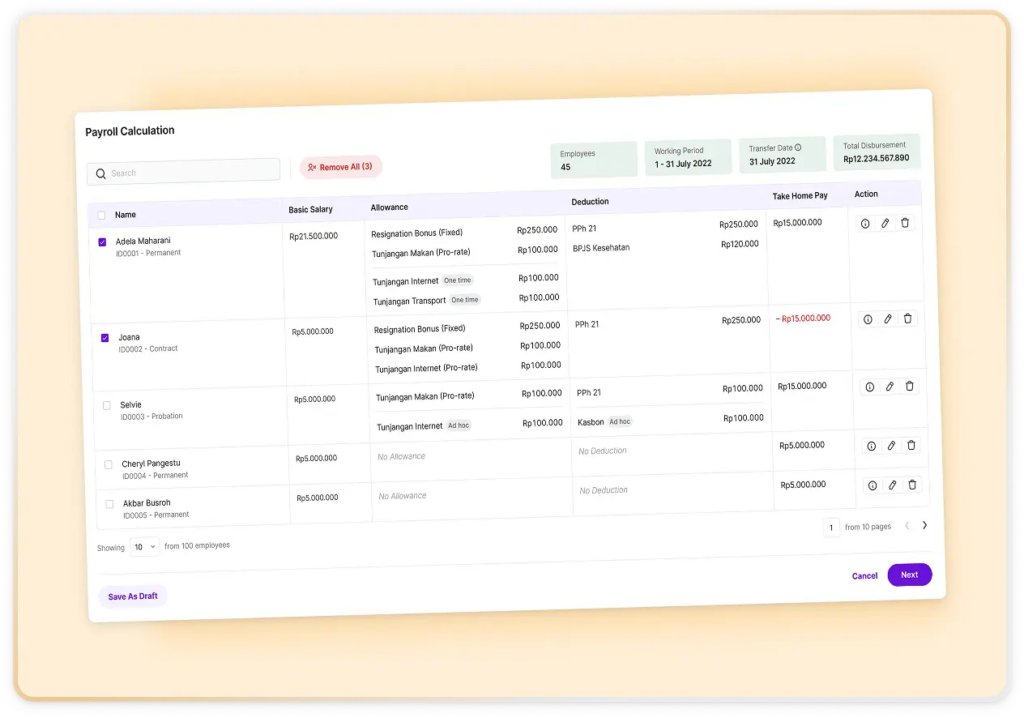 Kemudian, algoritma di dalamnya akan menghitung otomatis komponen pendapatan beserta potongan (seperti PPh 21 dan BPJS) sesuai regulasi pemerintah dan aturan perusahaan.