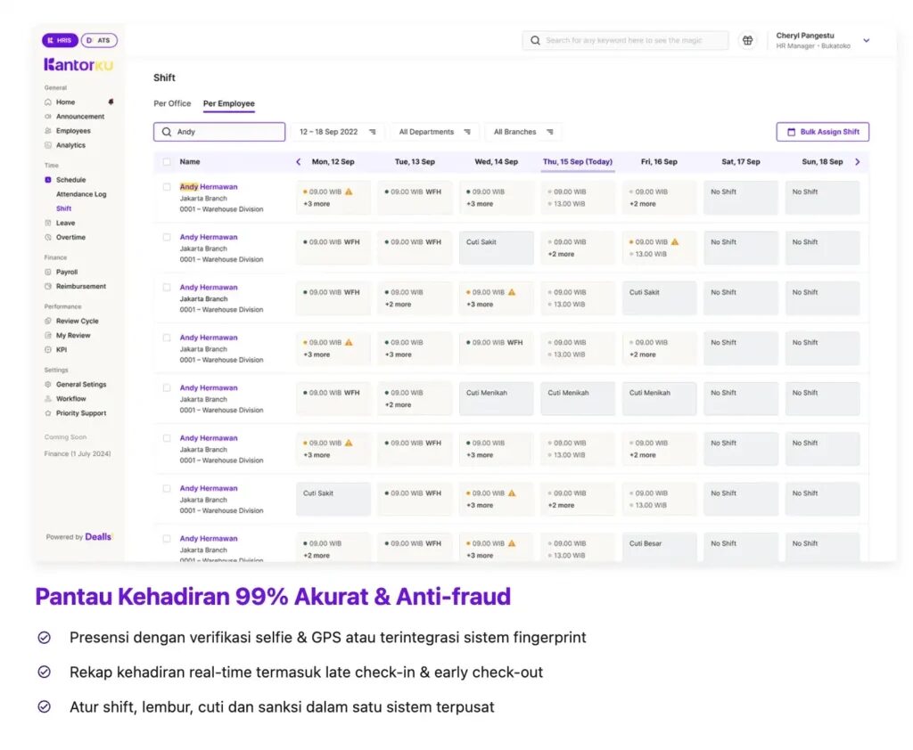 Gunakan KantorKu HRIS untuk mengatur jadwal kerja, absensi, dan shift karyawan secara lebih praktis selama Ramadan.