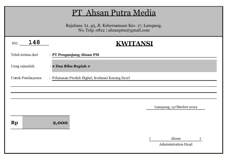 Berikan nomor kwitansi unik sebagai identifikasi transaksi. Nomor ini bisa disusun secara berurutan untuk memudahkan pencatatan dan audit.
