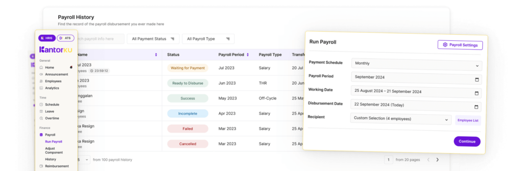 Dengan integrasi antara rekening payroll dan KantorKu HRIS, Anda dapat mentransfer gaji ke berbagai rekening bank karyawan hanya dalam satu kali klik tanpa perlu melakukan input manual yang memakan waktu.