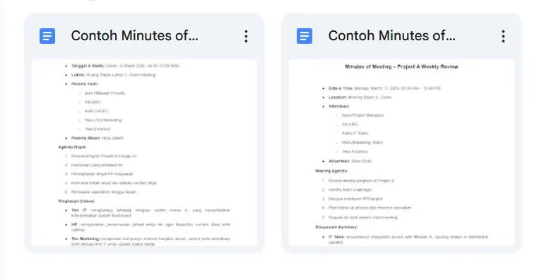Bagian ini menunjukkan contoh MoM sederhana dalam bahasa Indonesia yang bisa langsung dicatat di dokumen Word atau Google Docs.