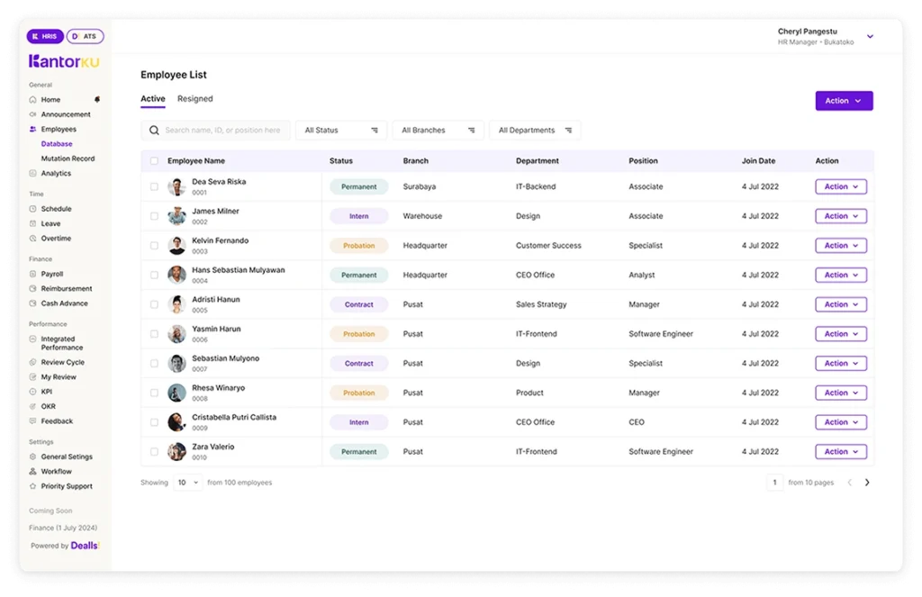 Melalui sistem ini, berbagai kebutuhan administrasi HR dapat dikelola dengan lebih mudah, seperti: