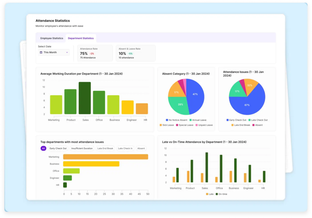 Absensi merupakan indikator awal untuk melihat disiplin kerja tim. Jika menggunakan aplikasi absensi karyawan, data kehadiran akan tercatat rapi, sehingga memudahkan Anda untuk mengenali apakah ada pola keterlambatan atau penurunan disiplin kerja.