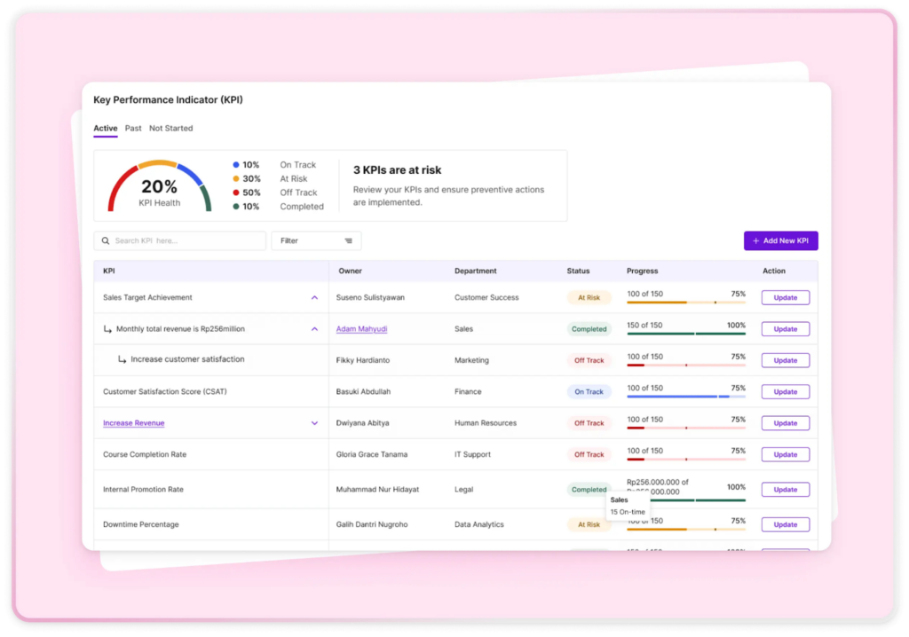 Salah satu cara menjaga tim tetap on track adalah memantau performa kerja secara objektif. Anda bisa menggunakan aplikasi KPI gratis untuk melihat progres KPI karyawan maupun tim tanpa micromanage.
