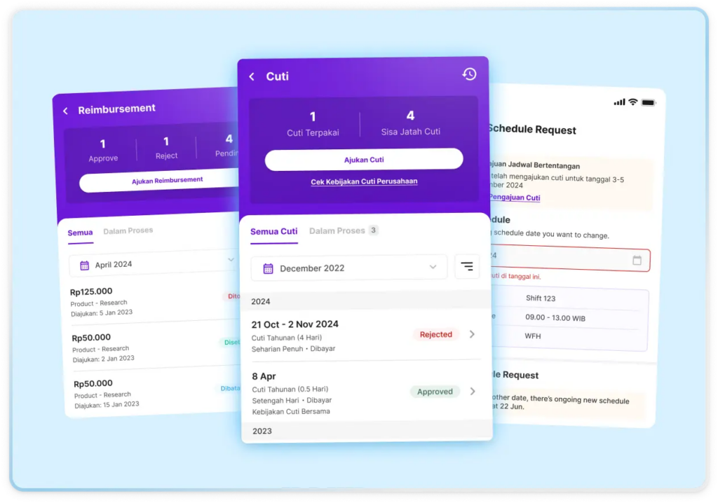 Oleh karena itu, Anda bisa mulai menggunakan aplikasi employee self service, yang memungkinkan karyawan mengajukan cuti secara online dari ponsel. Tugas HR hanya perlu menyetujui cuti sekali klik dari dashboard digital.
