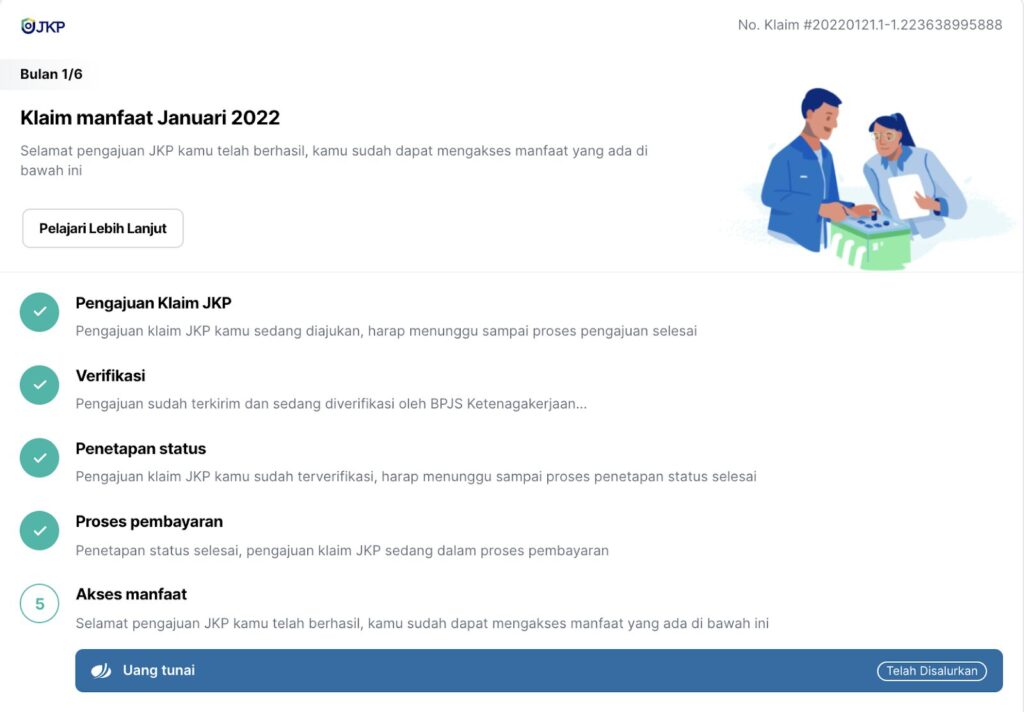 Pada bulan ke-1, dana dibayarkan setelah peserta mengajukan klaim awal dan menyelesaikan asesmen diri pada layanan informasi pasar kerja di portal SIAPKerja.