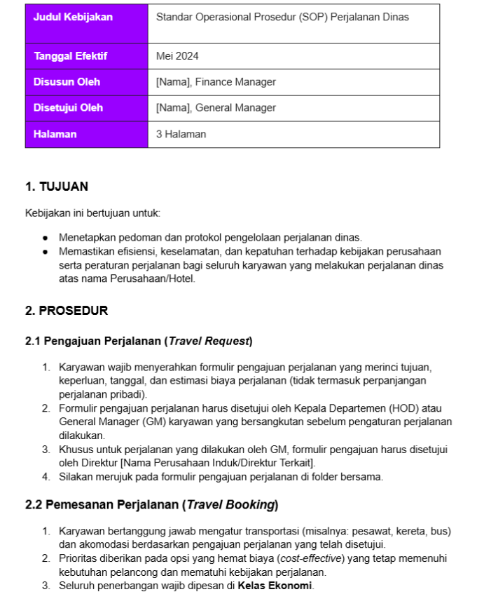 Kelengkapan dokumen ini membantu HR, Finance, dan karyawan memastikan proses persetujuan, pelaksanaan, hingga pelaporan perjalanan bisnis berjalan lancar.