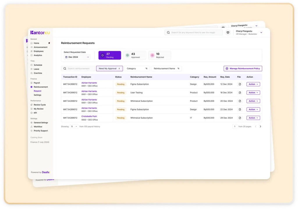 Kabar baiknya, Anda bisa urus reimbursement pakai aplikasi reimburse karyawan dari KantorKu HRIS agar pengajuan klaim dapat dikelola lebih cepat dan terkontrol.