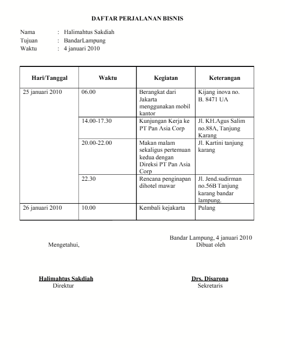 - Itinerary Perjalanan, merangkum jadwal penerbangan, akomodasi, agenda kerja, dan kontak penting selama perjalanan bisnis.