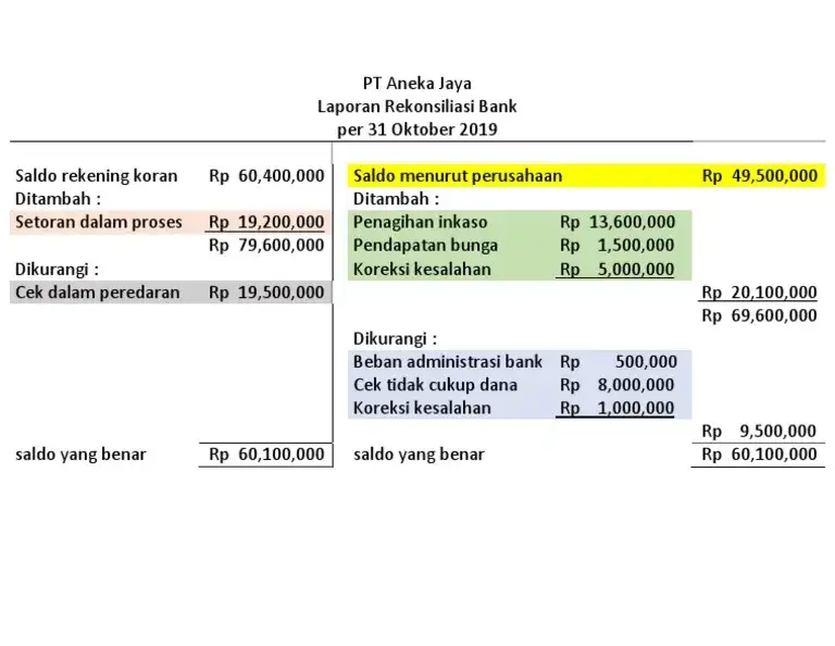 Setelah semua langkah di atas selesai, saldo akhir di buku perusahaan dan saldo bank yang telah disesuaikan harus menunjukkan angka yang sama.