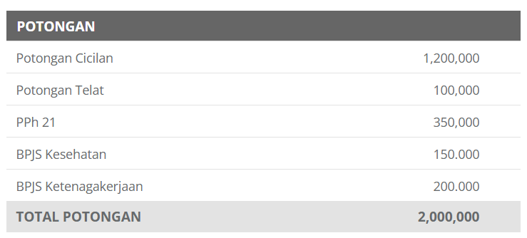 Potongan adalah pengurangan yang dikenakan pada penghasilan karyawan. Komponen ini harus ditampilkan secara transparan agar karyawan memahami alasan berkurangnya gaji yang diterima.