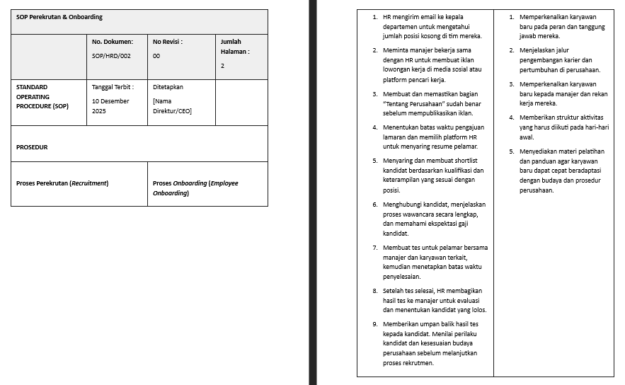 Tujuan: Menstandarisasi proses rekrutmen dan onboarding agar setiap karyawan baru mendapatkan pengalaman yang seragam dan profesional.