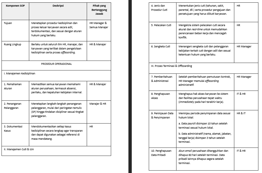 Dengan adanya SOP yang jelas, perusahaan bisa mencegah perselisihan hukum, memastikan perlakuan adil, dan menjaga budaya kerja yang konsisten.
