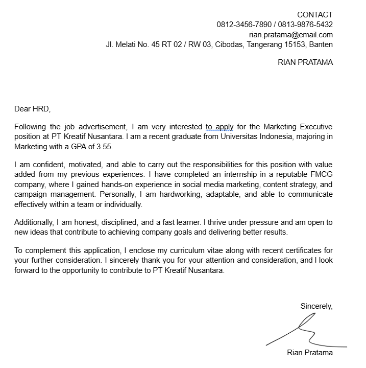 “Saya sangat tertarik untuk melamar posisi Digital Marketing Executive di PT Kreatif Nusantara yang saya temukan melalui website resmi perusahaan.