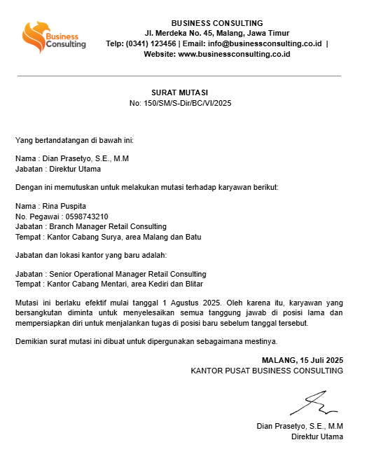 - Alasan mutasi, misalnya rotasi, promosi, atau restrukturisasi.