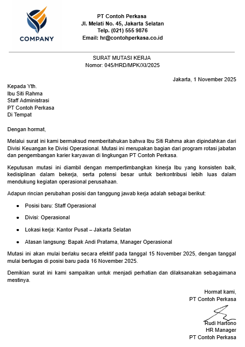 Di dalamnya tercantum informasi penting seperti tanggal efektif mutasi, syarat dan ketentuan baru, kelanjutan hak serta manfaat karyawan, hingga persyaratan administratif yang perlu dipenuhi.