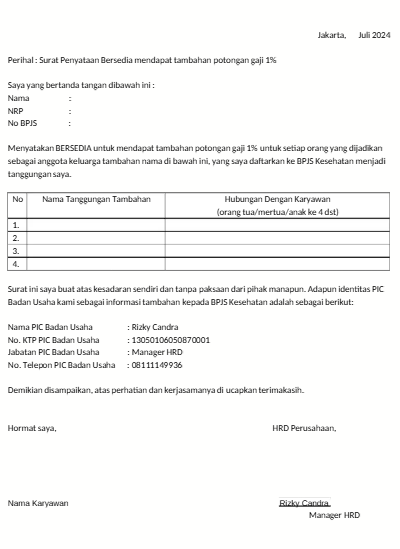 Contoh surat pernyataan pemotongan gaji untuk BPJS Kesehatan bisa digunakan saat perusahaan memotong iuran BPJS Kesehatan atau Ketenagakerjaan.