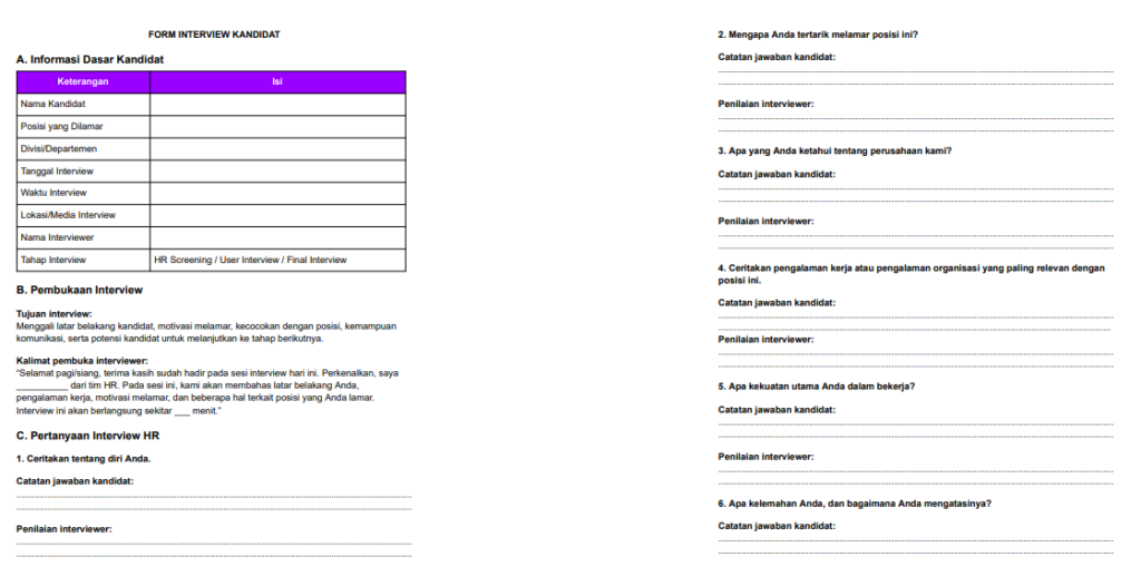 Format ini membantu jika perusahaan ingin membuat hasil interview lebih terukur dan mudah dibandingkan.
