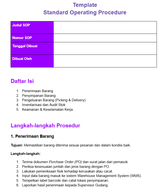 Berhubung warehouse termasuk lingkup kerja yang luas, maka SOP perlu dibuat detail, seperti pada template berikut: