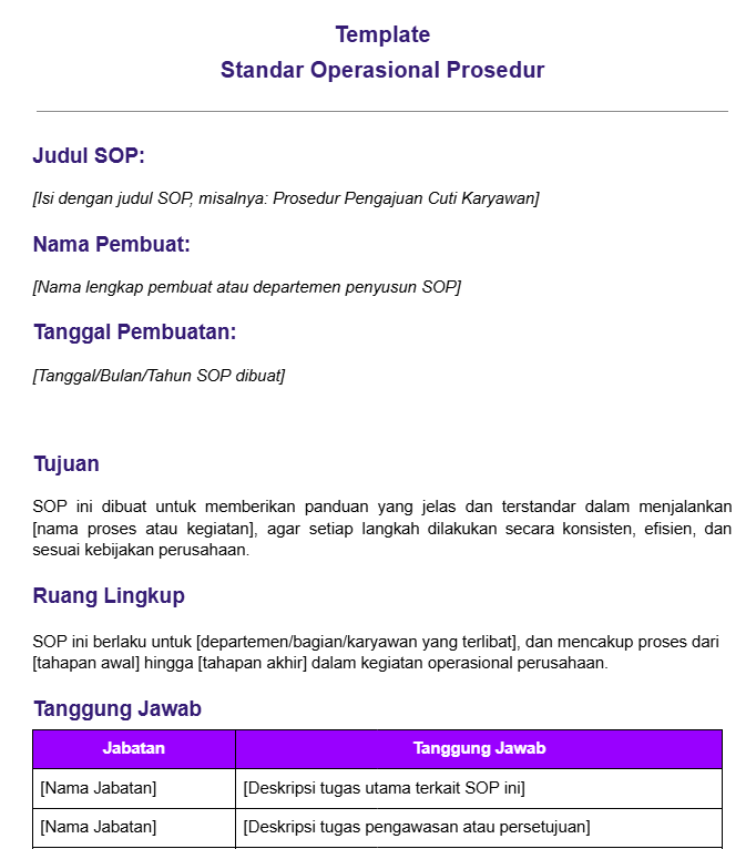 Template ini fleksibel karena bisa langsung kamu edit di Microsoft Word atau Google Docs. Ideal jika kamu ingin menyesuaikan isi SOP dengan kebijakan internal perusahaan.
