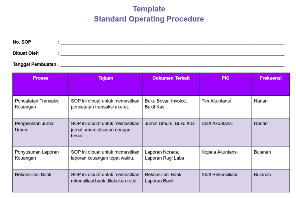 Download template SOP perusahaan gratis format Docx dan PDF untuk bidang IT, akuntansi, HR, admin dan lainnya. Tinggal klik!