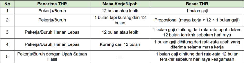 Pemerintah menetapkan bahwa THR minimal adalah 1 bulan upah bagi karyawan dengan masa kerja ≥12 bulan. Upah THR terdiri dari gaji pokok dan tunjangan tetap.