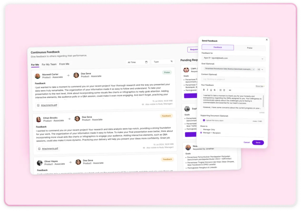 - 360° Performance Review untuk mengumpulkan evaluasi dari berbagai level secara objektif